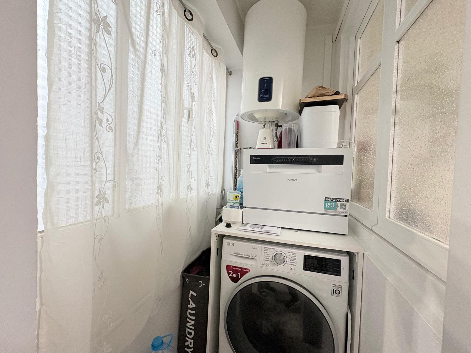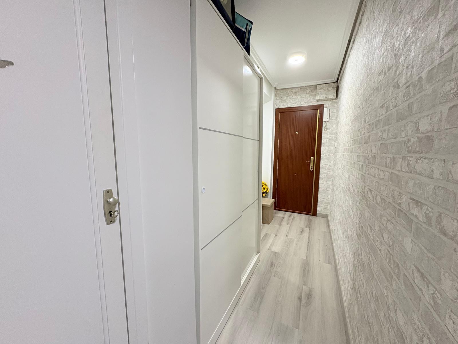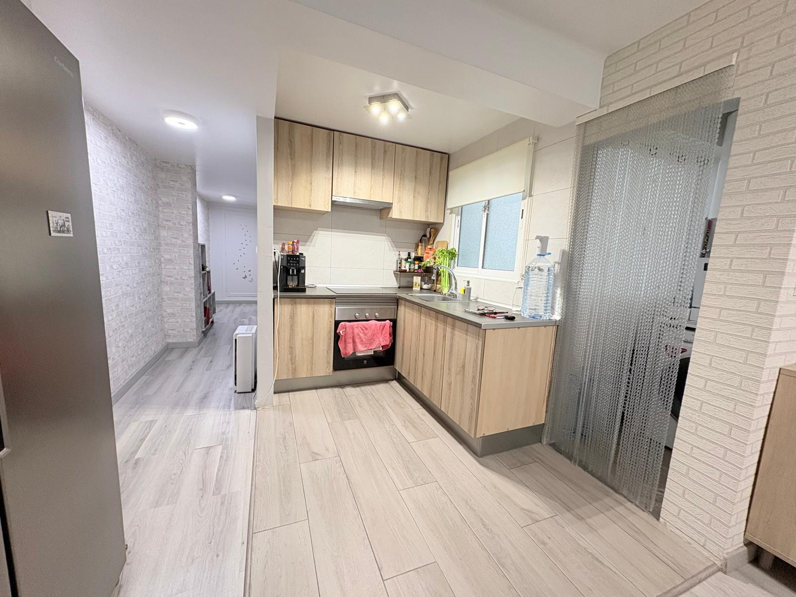 El salón, de paso distribuidor, cuenta con una cocina integrada que ha sido reformada con un diseño abierto y moderno, favoreciendo la interacción entre los espacios. La cocina está equipada con todo lo necesario para desarrollar cualquier actividad culinaria, y cuenta con una galería que proporciona un espacio adicional para lavadero. El baño también ha sido reformado y presenta una ducha funcional, con ventilación natural al patio de luces, asegurando comodidad y frescura. El vestíbulo actúa como distribuidor, y cuenta con un armario empotrado, brindando así un espacio extra para almacenamiento. El pasillo conecta todos los espacios de manera fluida, creando un ambiente de armonía y bienestar en el hogar. Además, el balcón de 2 metros a la calle oeste ofrece un pequeño rincón personal donde disfrutar del aire fresco.